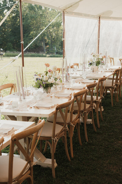 Sailcloth Tent 44×83 + Lighting, Smoked Oak Dance Floor, Wander Bar, Fringe Charger Mat, Cadence Glass, Gold/White Flatware, Crossback Vineyard Chair, Ghost Chair, Hoop Arbour, Blush Napkin, String Lights, Light Posts, Lounge Collection, Better Together Neon Sign, Gauze Table Runner in Sand, White Harvest Tables, June Table Number